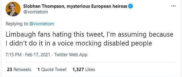 In a subsequent tweet she added, “Limbaugh fans hating this tweet, I’m assuming because I didn’t do it in a voice mocking disabled people.”