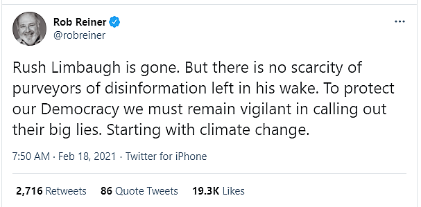 New Girl actor Rob Reiner wrote, “Rush Limbaugh is gone. But there is no scarcity of purveyors of disinformation left in his wake. To protect our Democracy we must remain vigilant in calling out their big lies. Starting with climate change.”