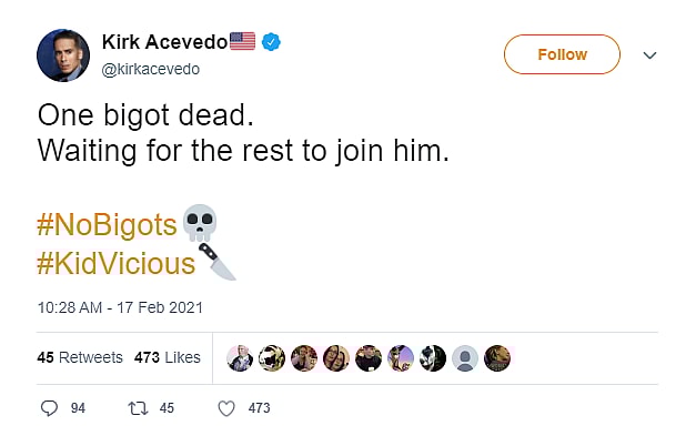 Kirk Acevedo also wrote on Twitter, “One bigot dead. Waiting for the rest to join him. #NoBigots #KidVicious.”