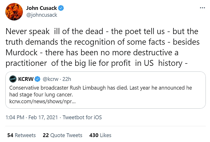Actor John Cusack wrote, “Never speak ill of the dead – the poet tells us – but the truth demands the recognition of some facts – besides Murdock – there has been no more destructive practitioner of the big lie for profit in US history -”