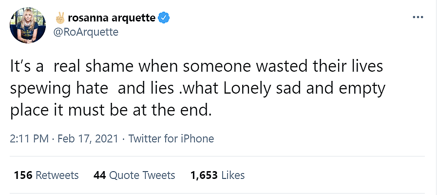 Rosanna Arquette wrote, “It’s a real shame when someone wasted their lives spewing hate and lies. what Lonely sad and empty place it must be at the end.”