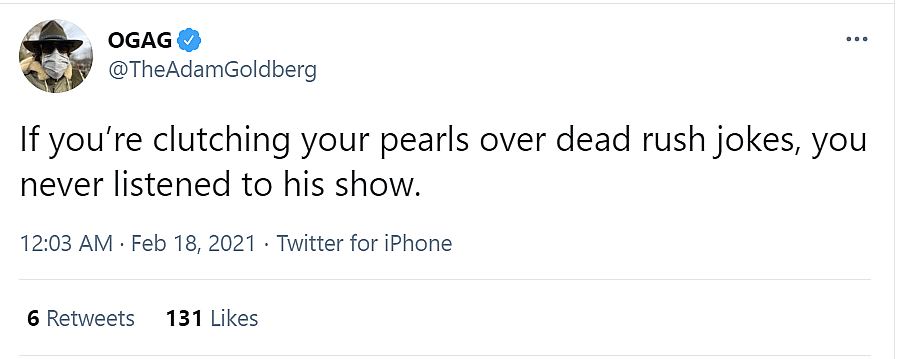 God Friended Me And Taken actor Adam Goldberg wrote, “If you’re clutching your pearls over dead rush jokes, you never listened to his show.”