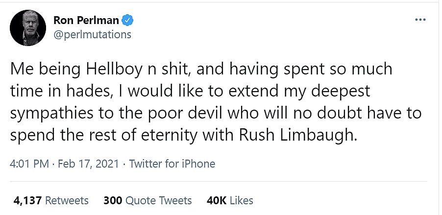 Hellboy actor Ron Perlman stated, “Me being Hellboy n shit, and having spent so much time in hades, I would like to extend my deepest sympathies to the poor devil who will no doubt have to spend the rest of eternity with Rush Limbaugh.”