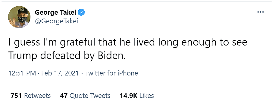Star Trek actor George Takei stated, “I guess I’m grateful that he lived long enough to see Trump defeated by Biden.”