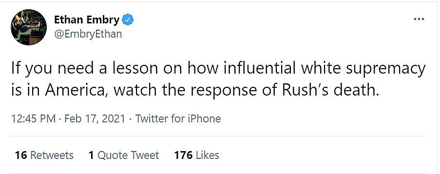 Sweet Home Alabama and Grace & Frankie actor Ethan Embry posted to Twitter, “If you need a lesson on how influential white supremacy is in America, watch the response of Rush’s death.”