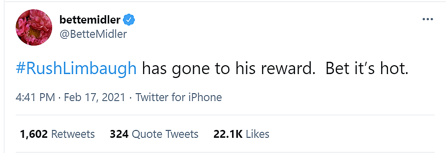 Bette Midler wrote on Twitter, “#RushLimbaugh has gone to his reward. Bet it’s hot.”