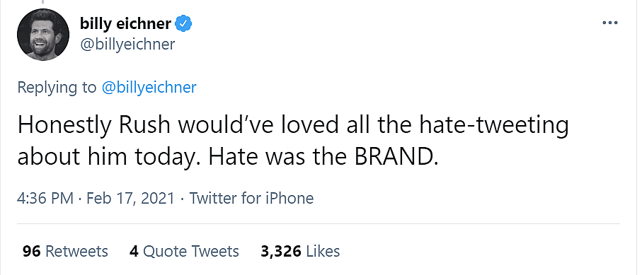 In a subsequent tweet, he added, “Honestly Rush would’ve loved all the hate-tweeting about him today. Hate was the BRAND.”