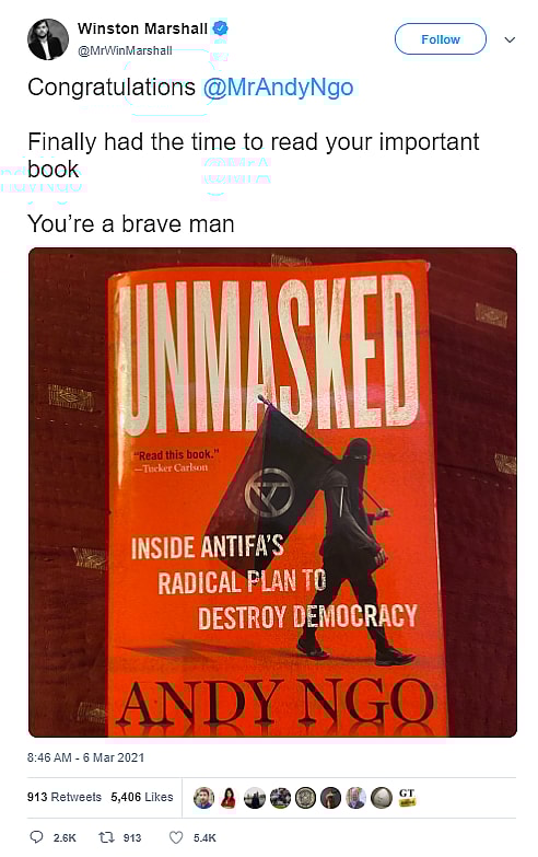 In a June 24th Medium post, Marshall wrote, “At the beginning of March I tweeted to American journalist Andy Ngo, author of the New York Times Bestseller, Unmasked. ‘Congratulations @MrAndyNgo. Finally had the time to read your important book. You’re a brave man’.”