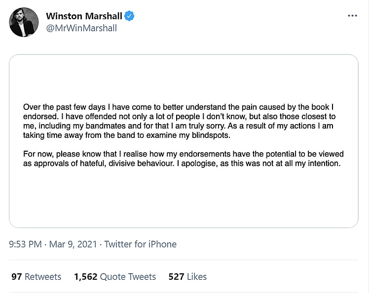 On account of the backlash the Mumford and Sons banjoist faced upon giving praise to Ngô for the publication of his book, Marshall took to Twitter to announce that he was taking some time away from the band and apologise for showing support for the book.