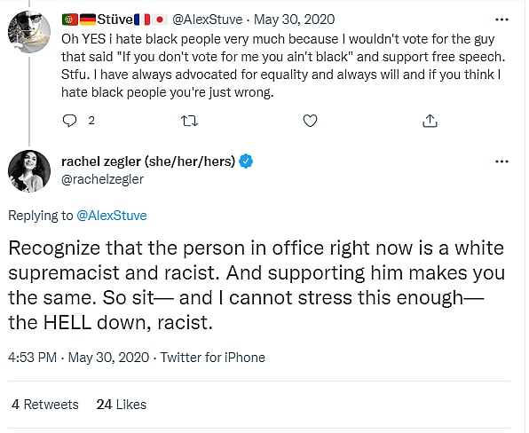 The user responded to Zegler, “Oh YES i hate black people very much because I wouldn’t vote for the guy that said ‘If you don’t vote me you ain’t black’ and support free speech. Stfu. I have always advocated for equality and always will and if you think I hate black people you’re just wrong.”