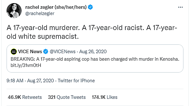 Zegler responded on Twitter writing, “A 17-year-old murderer. A 17-year-old racist. A 17-year-old white supremacist.”