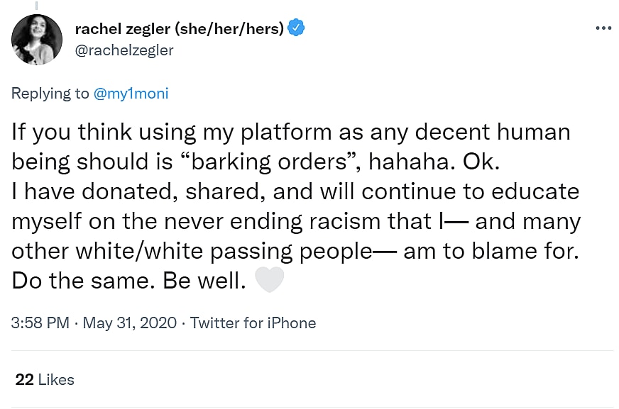 Back in May 2020, she tweeted, “If you think using my platform as any decent human being should is ‘barking orders’, hahaha. Ok. I have donated, shared, and will continue to educate myself on the never ending racism that I— and many other white/white passing people— am to blame for. Do the same. Be well.”