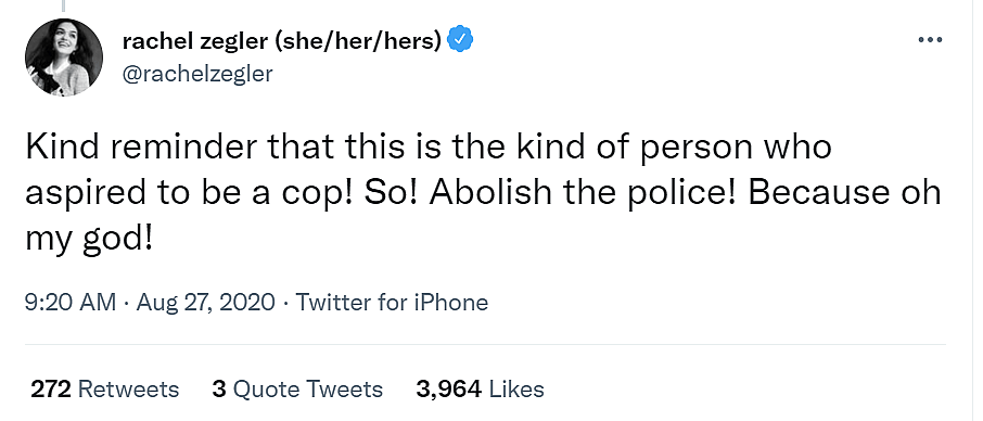 Zegler wrote, “Kind reminder that this is the kind of person who aspired to be a cop! So! Abolish the police! Because oh my god!”