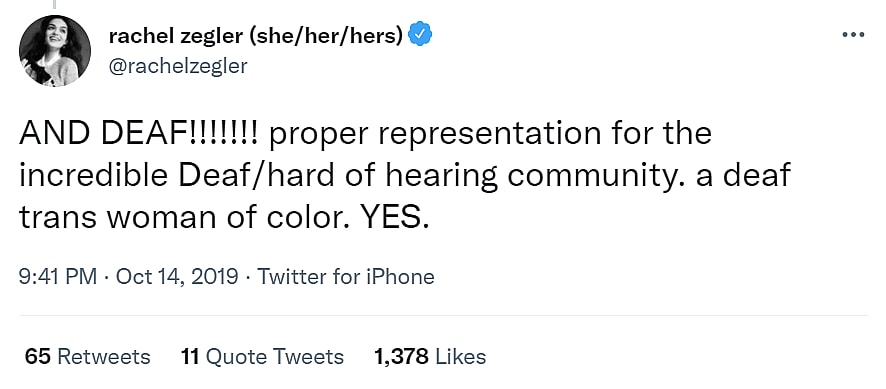 She then added, “AND DEAF!!!!!!! proper representation for the incredible Deaf/hard of hearing community. a deaf trans woman of color. YES.”