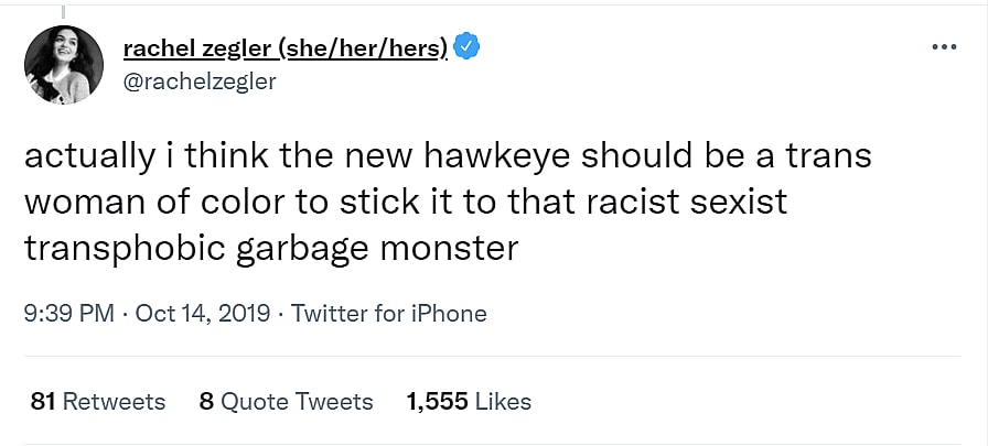 She followed that up writing, “actually i think the new hawkeye should be a trans woman of color to stick it to that racist sexist transphobic garbage monster.”