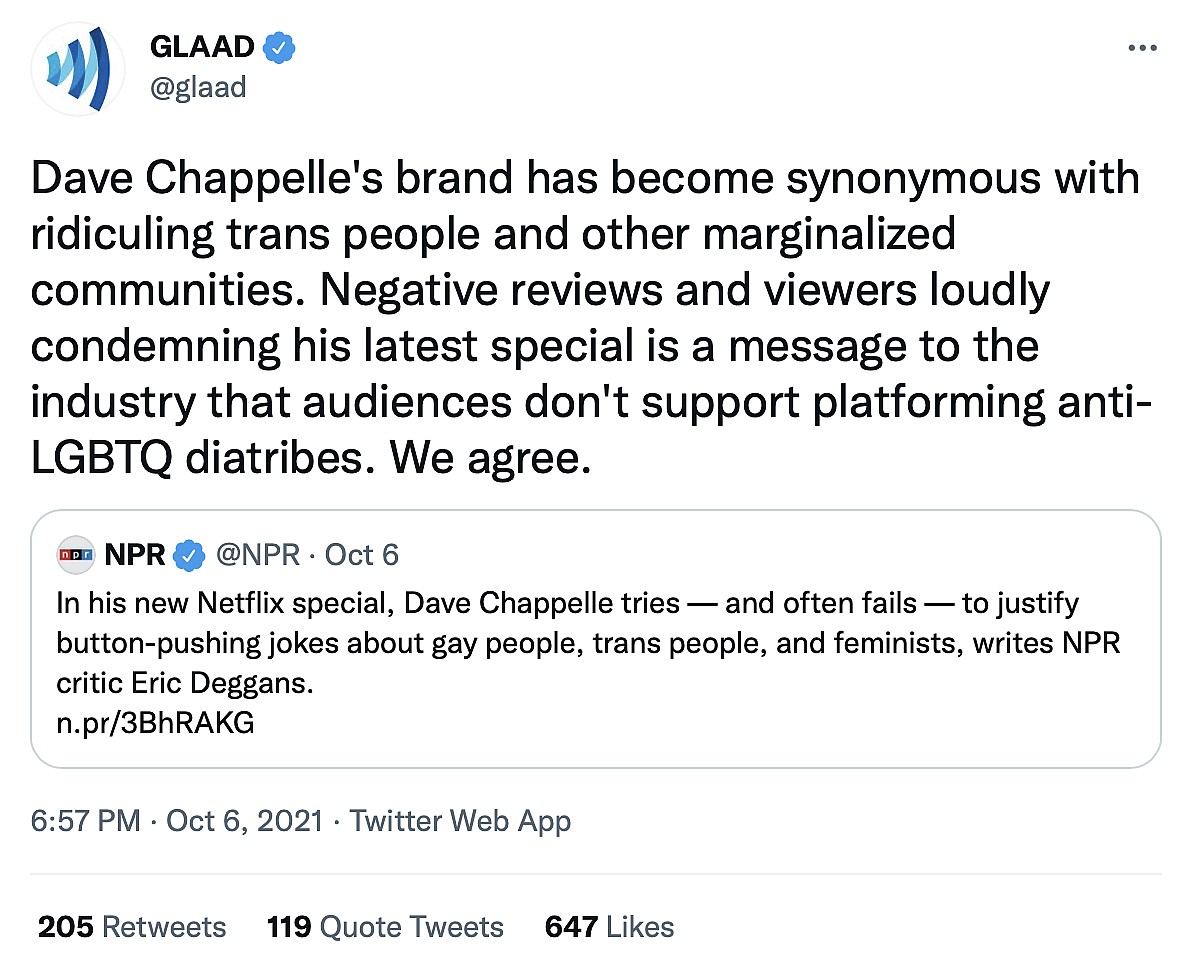 LGBT lobbying group GLAAD took to Twitter to state, “Dave Chappelle’s brand has become synonymous with ridiculing trans people and other marginalized communities. Negative reviews and viewers loudly condemning his latest special is a message to the industry that audiences don’t support platforming anti-LGBTQ diatribes. We agree.”