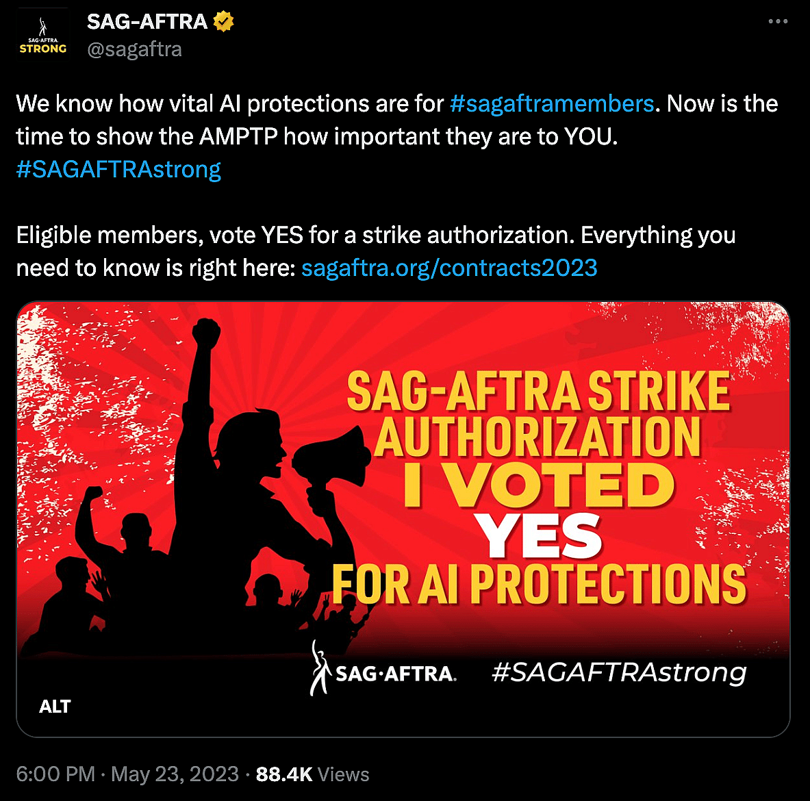 “Technology has advanced at a rapid pace,” wrote the guild. “Artificial intelligence has already proven to be a real and immediate threat to the work of our members and can mimic members’ voices, likenesses and performances. We must get agreement around acceptable uses, bargain protections against misuse, and ensure consent and fair compensation for the use of your work to train AI systems and create new performances.”