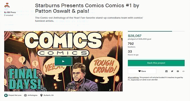 However, despite the exceptionally talented team of comedians, writers, and artists, Starburns Presents Comics Comics #1 by Patton Oswalt & pals! may not see publication. The Kickstarter campaign opened on August 22nd 2018, and as of the writing of this article, the campaign has only made $28,067 of it’s $36,000 goal, with less than two days remaining for the campaign.