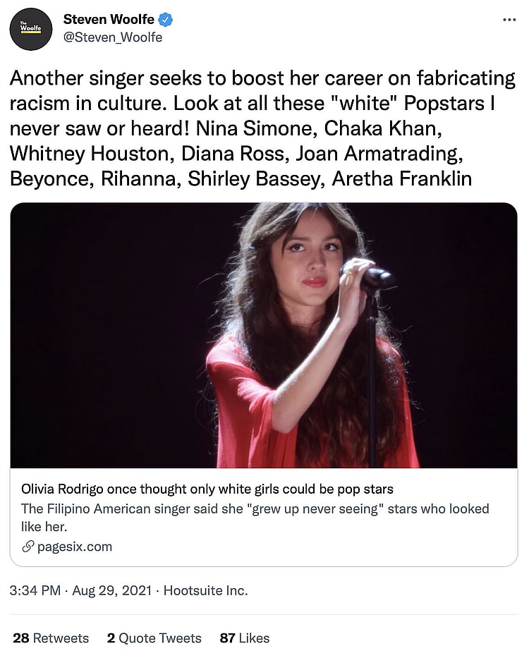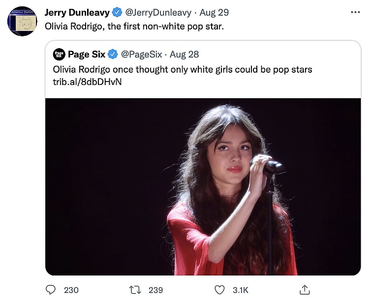 Mocking Rodrigo’s comments, Washington Examiner Justice Department reporter Jerry Dunleavy sarcastically wrote, “Olivia Rodrigo, the first non-white pop star.”