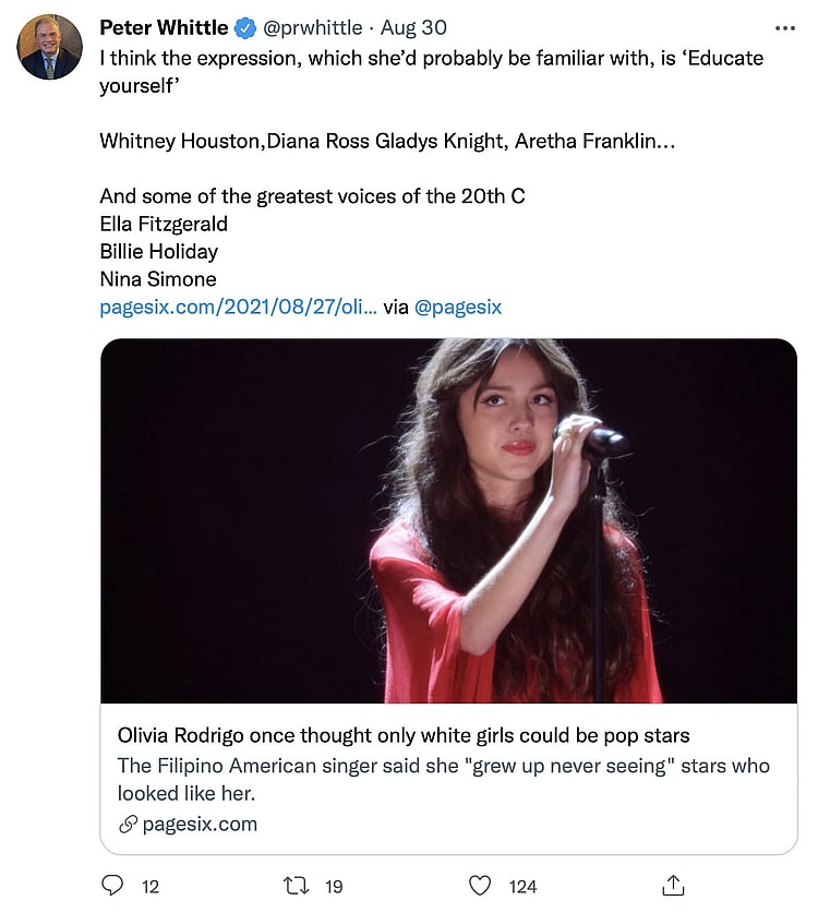 British politician Peter Whittle was also unimpressed by Olivia Rodrigo’s comments, writing, “I think the expression, which she’d probably be familiar with, is ‘Educate yourself,'” before, similar to Gaad, sharing a short list of Pop stars that included renowned artists like Whitney Houston, Diana Ross, Gladys Knight, and Aretha Franklin.