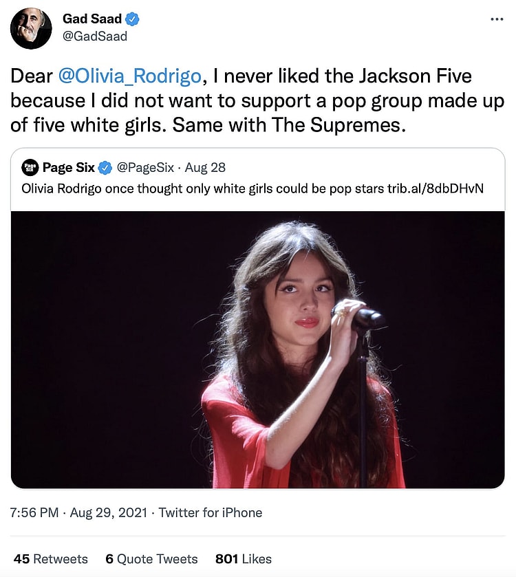 Psychologist Gad Saad provided a short list of Pop stars that are, most definitely, not “white girls”, throwing a wrench into Rodrigo’s previous assumption about the industry’s demographics.
