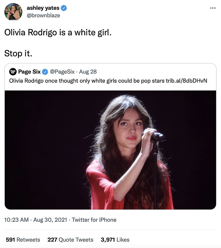 Blue checkmark Ashley Yates, for instance, questioned the artist’s recent comments, writing, “Olivia Rodrigo is a white girl. Stop it.”