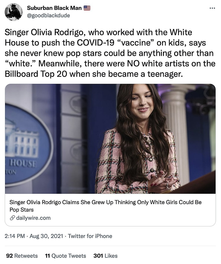 Twitter user @goodblackdude also criticised the singer’s poor choice of words, noting, “Singer Olivia Rodrigo, who worked with the White House to push the COVID-19 ‘vaccine’ on kids, says she never knew pop stars could be anything other than ‘white,'” before pointing out, “Meanwhile, there were NO white artists on the Billboard Top 20 when she became a teenager.”