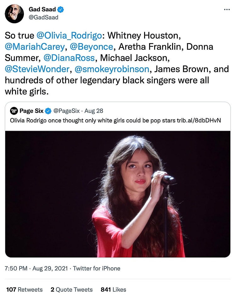 “So true @Olivia_Rodrigo,” wrote Saad, adding, “Whitney Houston, @MariahCarey, @Beyonce, Aretha Franklin, Donna Summer, @DianaRoss, Michael Jackson, @StevieWonder, @smokeyrobinson, James Brown, and hundreds of other legendary black singers were all white girls.”