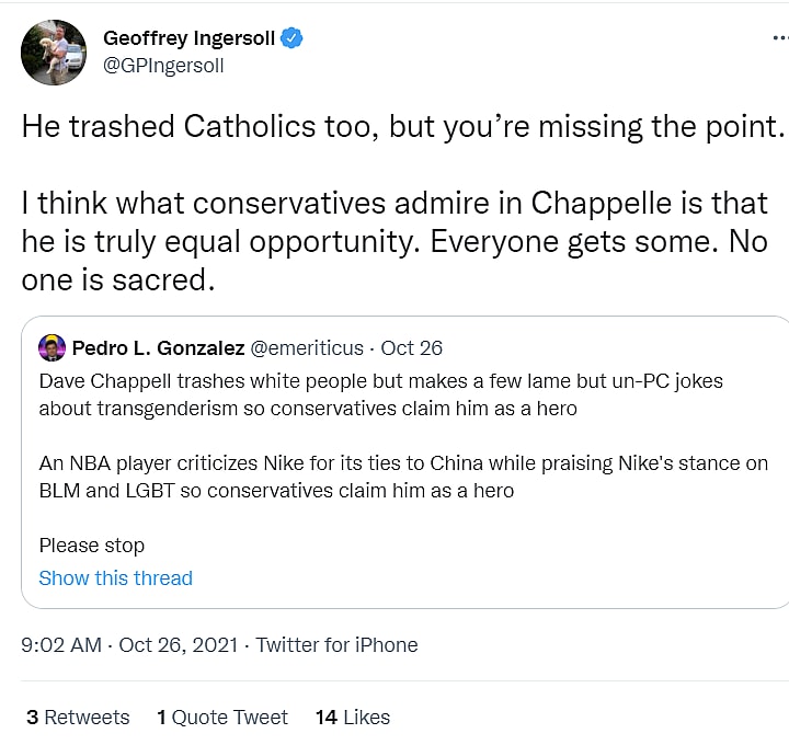 As critics of Gonzalez’s would point out Chappelle doesn’t just go after white people. The Daily Caller’s Geoffrey Ingersoll replied, “He trashed Catholics too, but you’re missing the point. I think what conservatives admire in Chappelle is that he is truly equal opportunity. Everyone gets some. No one is sacred.”