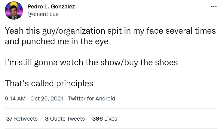 He further mockingly added, “Yeah this guy/organization spit in my face several times and punched me in the eye. I’m still gonna watch the show/buy the shoes. That’s called principles.”