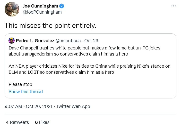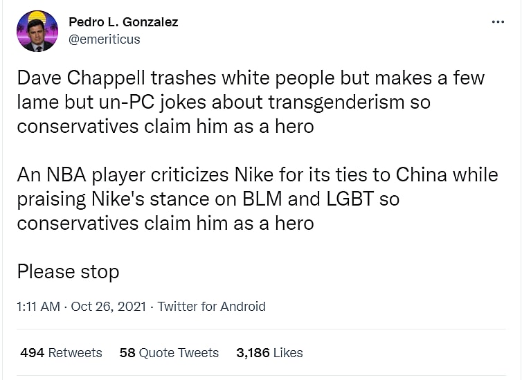 Gonzalez took to Twitter where he wrote, “Dave Chappell[e] trashes white people but makes a few lame but un-PC jokes about transgenderism so conservatives claim him as a hero.”