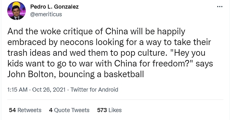 In a subsequent tweet Gonzalez added, “And the woke critique of China will be happily embraced by neocons looking for a way to take their trash ideas and wed them to pop culture. ‘Hey you kids want to go to war with China for freedom?’ says John Bolton, bouncing a basketball.”