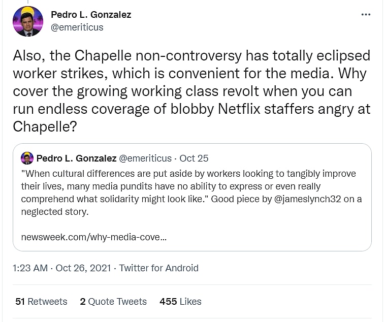 He further added, “Also, the Chapelle (sp?) non-controversy has totally eclipsed worker strikes, which is convenient for the media. Why cover the growing working class revolt when you can run endless coverage of blobby Netflix staffers angry at Chapelle (sp?)?”