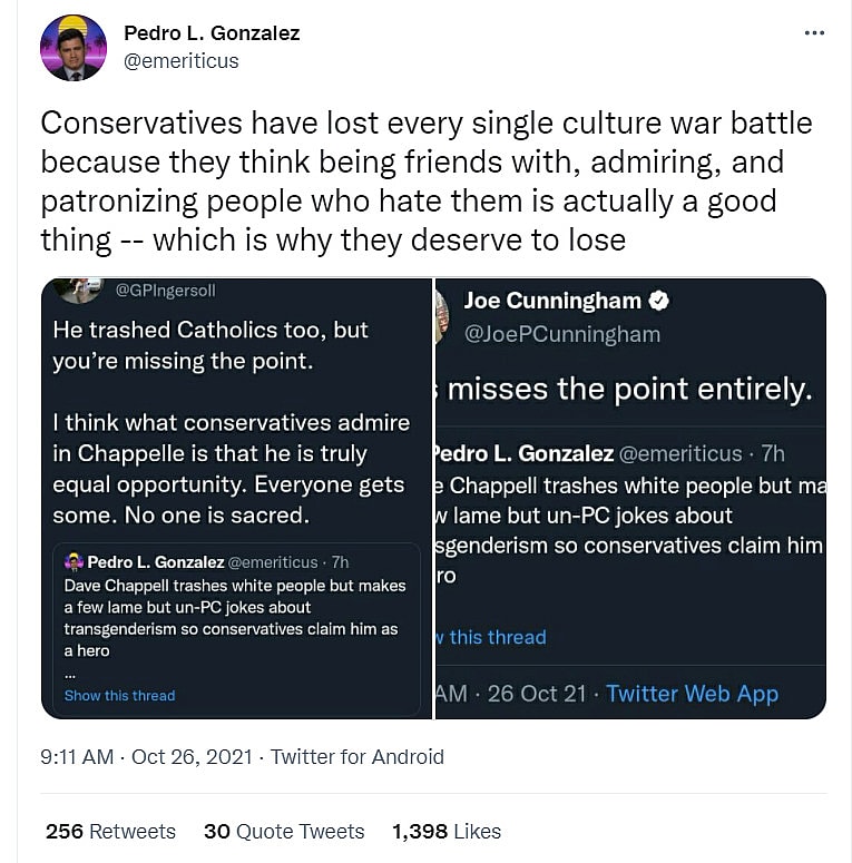 Political pundit and the Associate Editor at Chronicles: A Magazine of American Culture Pedro Gonzalez recently chided conservatives for making Dave Chappelle a hero.