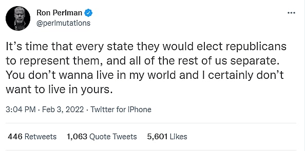 Perlman took to Twitter where he wrote, “It’s time that every state they would elect republicans to represent them, and all of the rest of us separate.”