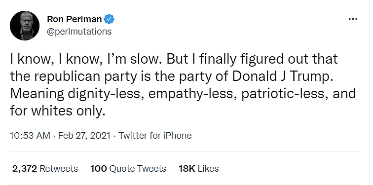 Perlman more recently opined, “I know, I know, I’m slow. But I finally figured out that the republican party is the party of Donald J Trump. Meaning dignity-less, empathy-less, patriotic-less, and for whites only.”