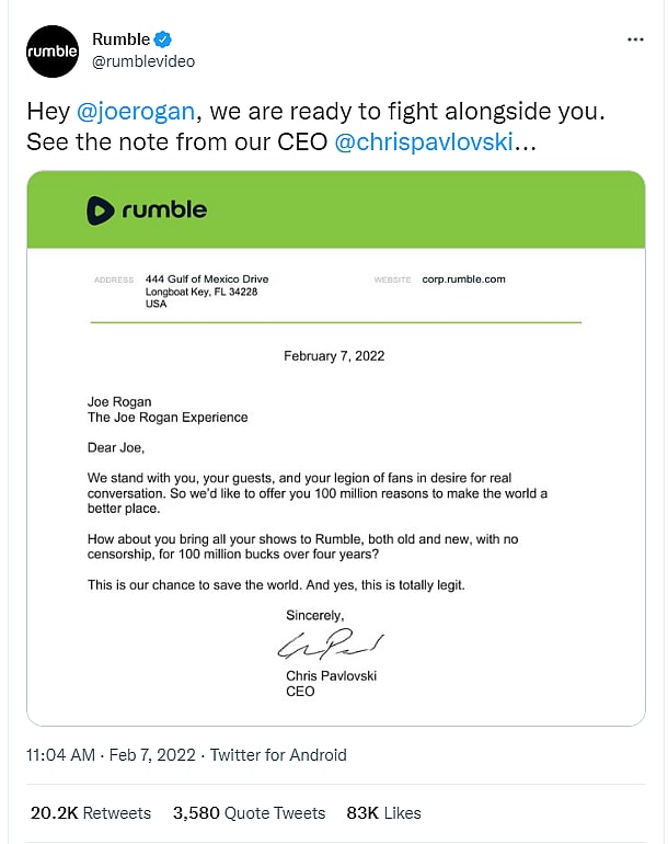 Rumble Offers Joe Rogan A $100 Million Dollar Deal