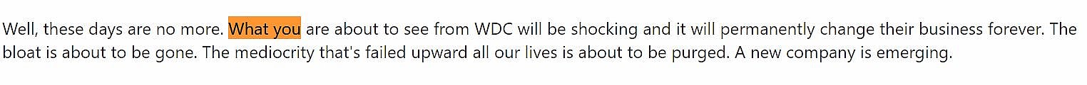 Pheneix elaborates, “What you are about to see from WDC will be shocking and it will permanently change their business forever. The bloat is about to be gone. The mediocrity that’s failed upward all our lives is about to be purged. A new company is emerging.”