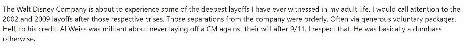 In a recent post to the forums titled, “On layoffs, very bad attendance, and Iger’s legacy being one of disgrace,” Pheneix details that “The Walt Disney Company is about to experience some of the deepest layoffs I have ever witnessed in my adult life.”
