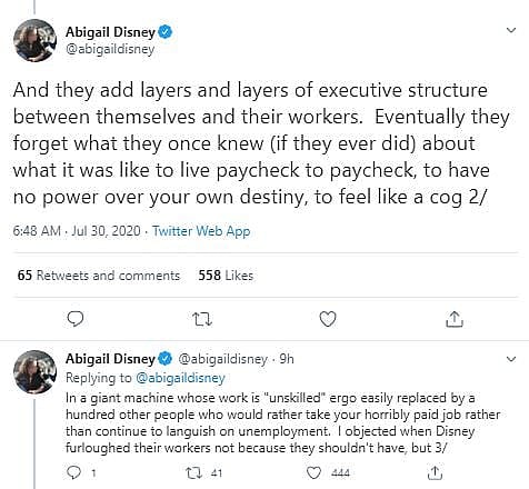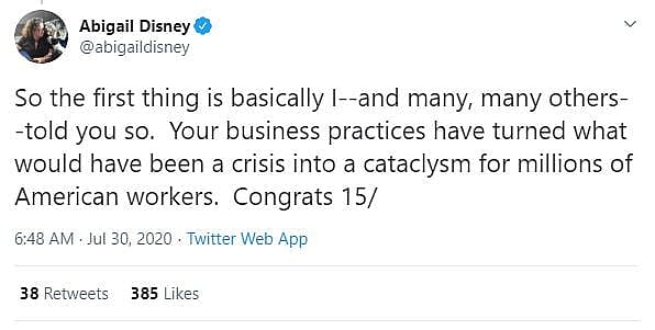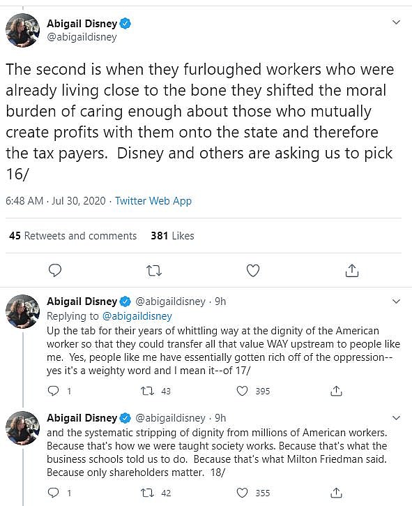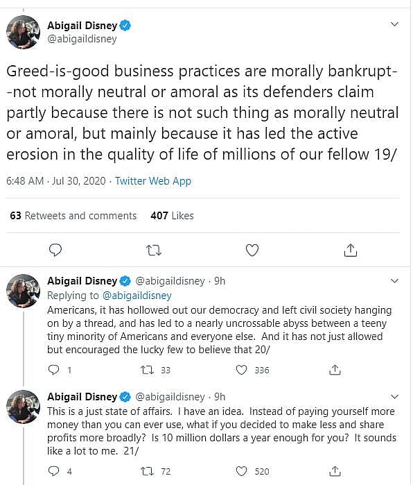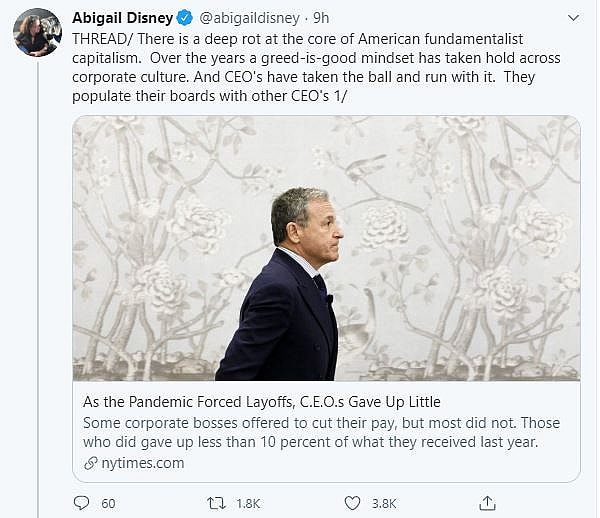 In a lengthy Twitter thread, Disney began by criticizing the current state of American businesses saying, “There is a deep rot at the core of American fundamentalist capitalism. Over the years a greed-is-good mindset has taken hold across corporate culture. And CEO’s have taken the ball and run with it.”