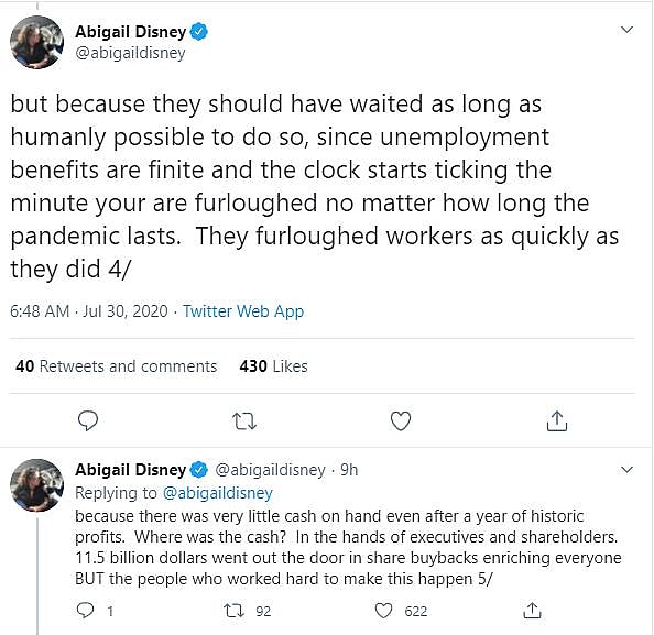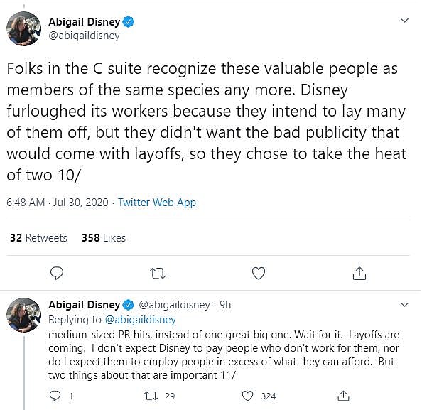 She wrote, “Disney furloughed its workers because they intend to lay many of them off, but they didn’t want the bad publicity that would come with layoffs, so they chose to take the heat of two medium-sized PR hits, instead of one great big one.”