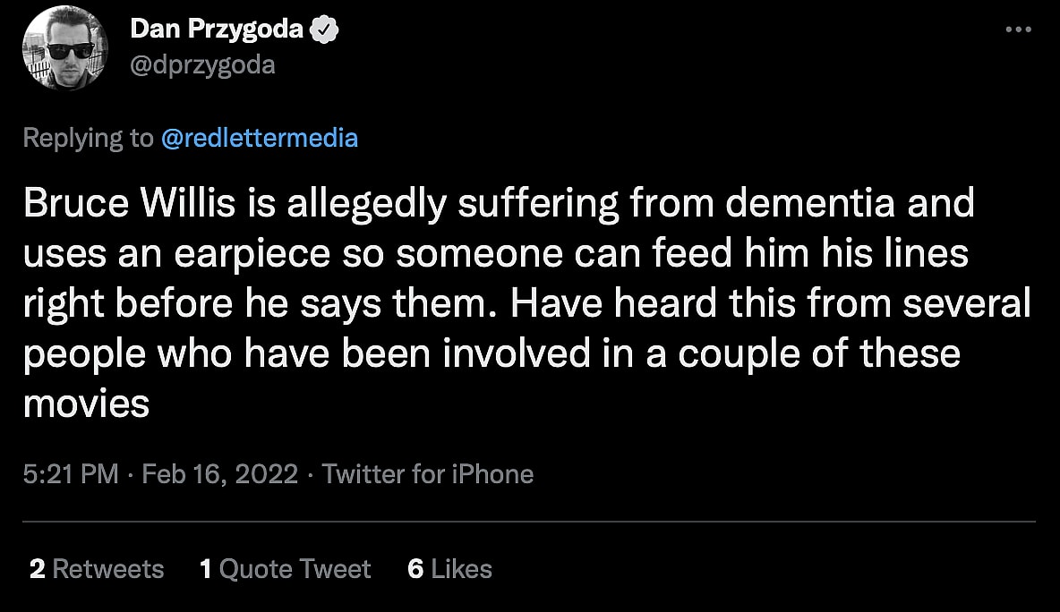 News producer and short film director Dan Przygoda also backed the claims that the Twelve Monkeys actor is battling dementia, writing under Red Letter Media’s Twitter post for the Bruce Willis episode, “Bruce Willis is allegedly suffering from dementia and uses an earpiece so someone can feed him his lines right before he says them.”