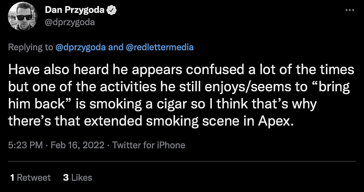 “Have also heard he appears confused a lot of the times but one of the activities he still enjoys/seems to ‘bring him back’ is smoking a cigar so I think that’s why there’s that extended smoking scene in Apex,” he wrote in a follow-up tweet.