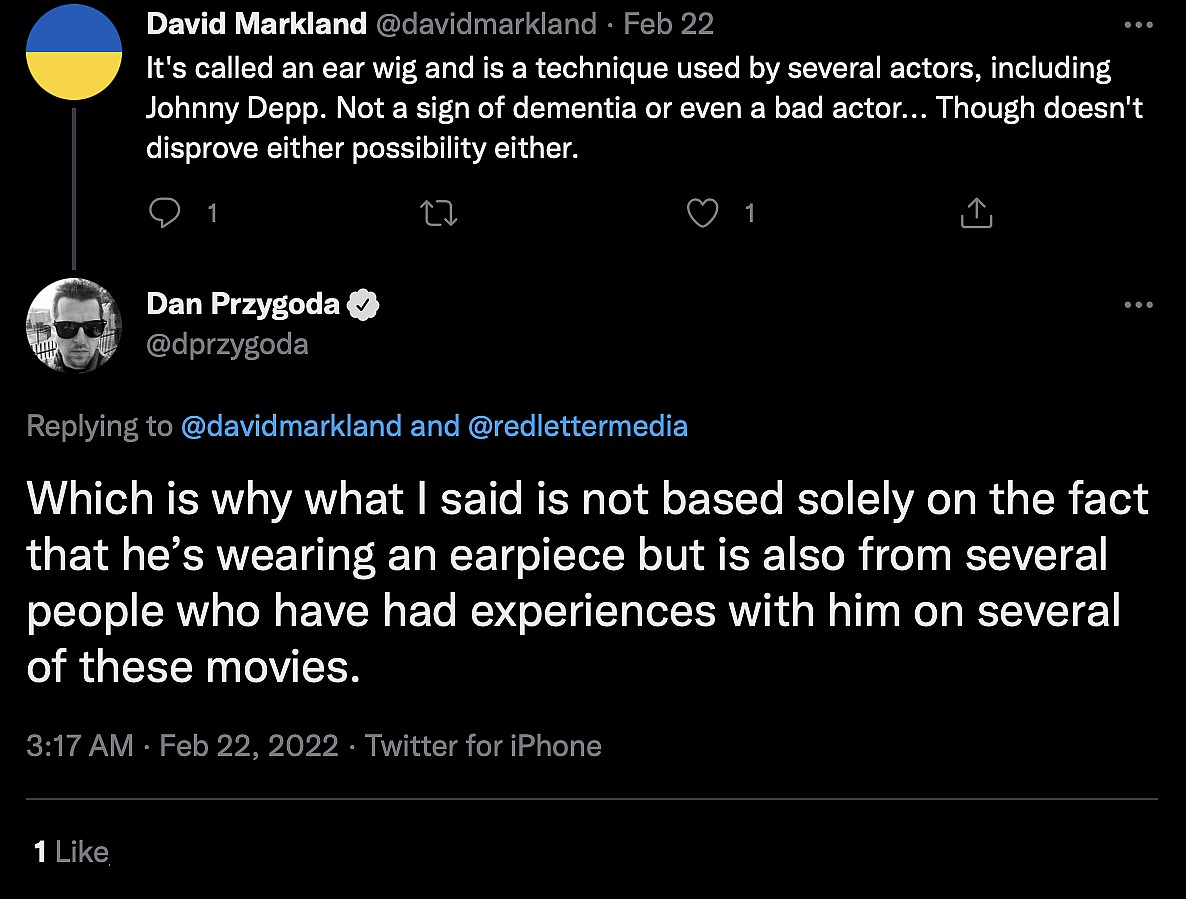 @davidmarkland replied to Przygoda’s comment, writing,”It’s called an ear wig and is a technique used by several actors, including Johnny Depp. Not a sign of dementia or even a bad actor… Though doesn’t disprove either possibility either.”