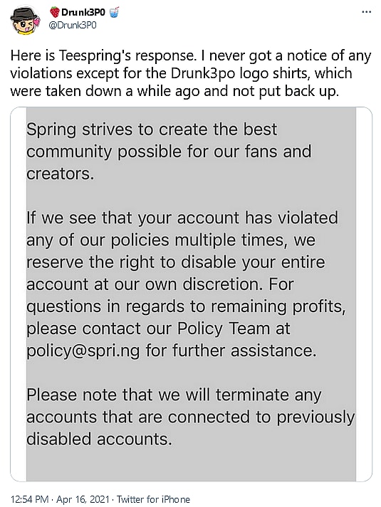 Drunk3PO reacted to this writing on Twitter, “I never got a notice of any violations except for Drunk3po logo shirts, which were taken down a while ago and not put back up.”