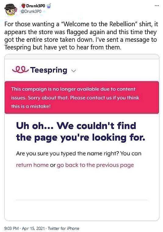 He wrote on Twitter, “For those wanting a ‘Welcome to the Rebellion’ shirt, it appears the store was flagged again and this time they got the entire store taken down. I’ve sent a message to Teespring but have yet to hear from them.”