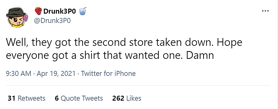 The store would in fact be taken down. Drunk3PO reported, “Well, they got the second store taken down. Hope everyone got a shirt that wanted one. Damn.”