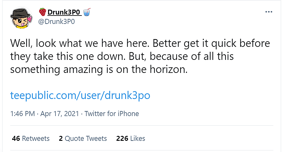 Drunk3PO shared to Twitter, “Well, look what we have here. Better get it quick before they take this one down. But, because of all this something amazing is on the horizon.”