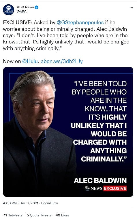 During his interview with ABC News, Baldwin claimed that the shot that killed Halyna Hutchins and injured Joel Souza was “incidental” and from an angle that may “not have ended up in the film,” going over the steps he followed before accidentally discharging the gun.