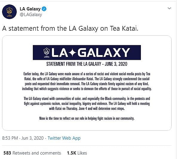 The Galaxy issued a statement to Twitter on June 3rd condemning Katai’s posts and indicating that they asked for them to be immediately removed.